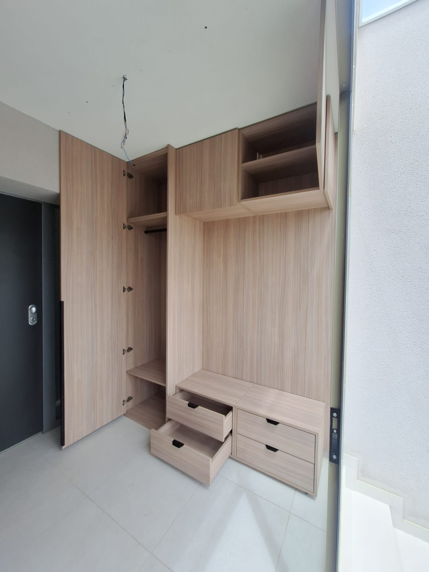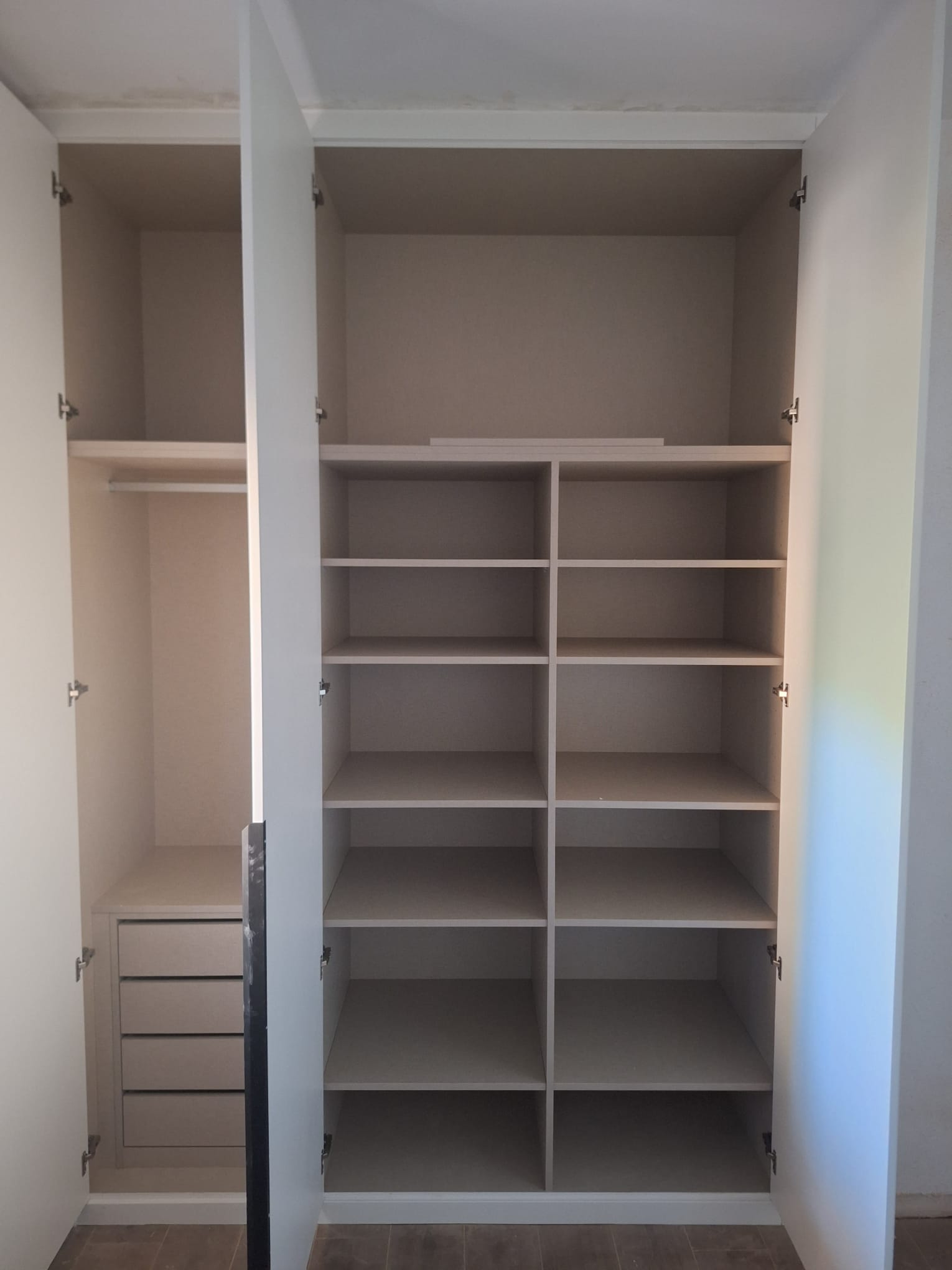 Optamos por un diseño limpio, con líneas rectas y un acabado en madera natural que aporta elegancia sin recargar el ambiente. El interior del armario fue distribuido según las necesidades del cliente, incluyendo barras para colgar, baldas regulables y cajones de cierre suave, todo pensado para facilitar el orden diario y prolongar la durabilidad de la estructura.