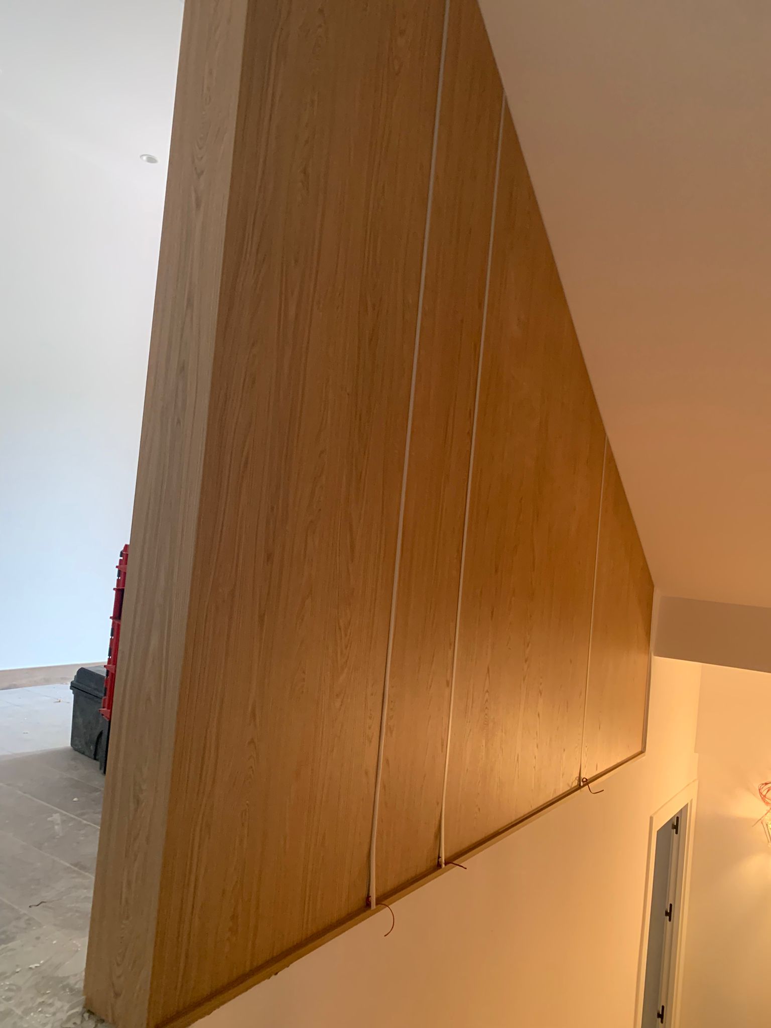 Por último, revestimos en madera el hueco de la escalera, un detalle que transforma completamente la percepción del espacio. Este tipo de trabajos permite integrar visualmente zonas que, de otro modo, podrían quedar frías o desaprovechadas.