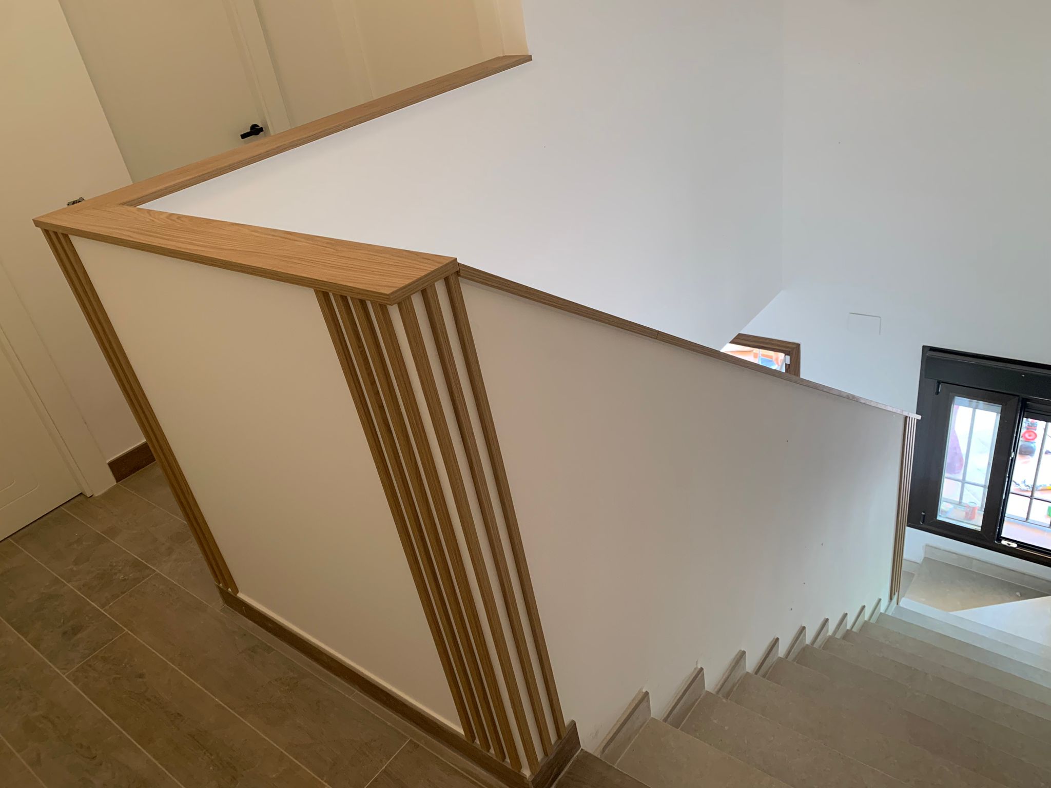 También diseñamos y fabricamos la barandilla de la escalera, buscando un equilibrio entre seguridad y estética. Utilizamos madera maciza tratada y acabada a mano, asegurando tanto la resistencia como la armonía con el resto de elementos de la vivienda.