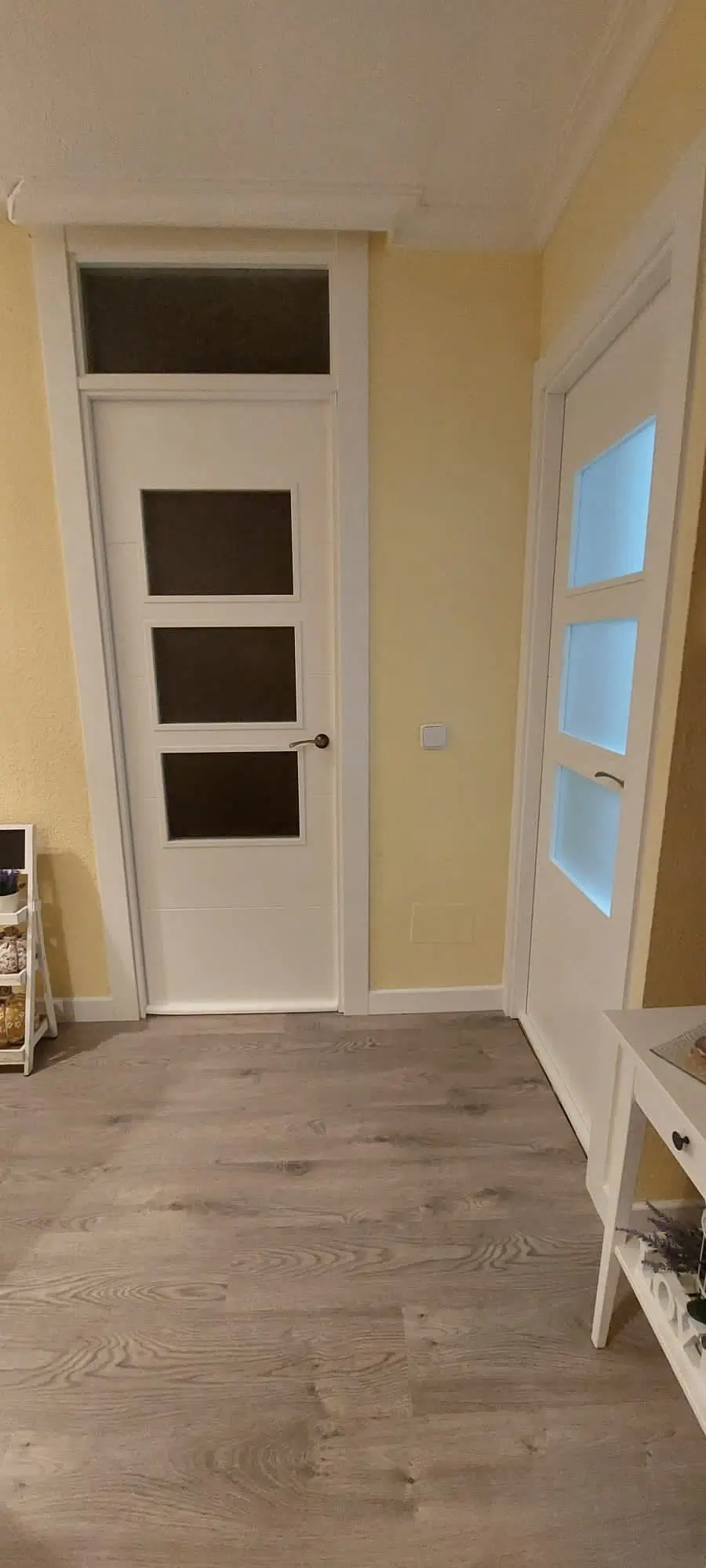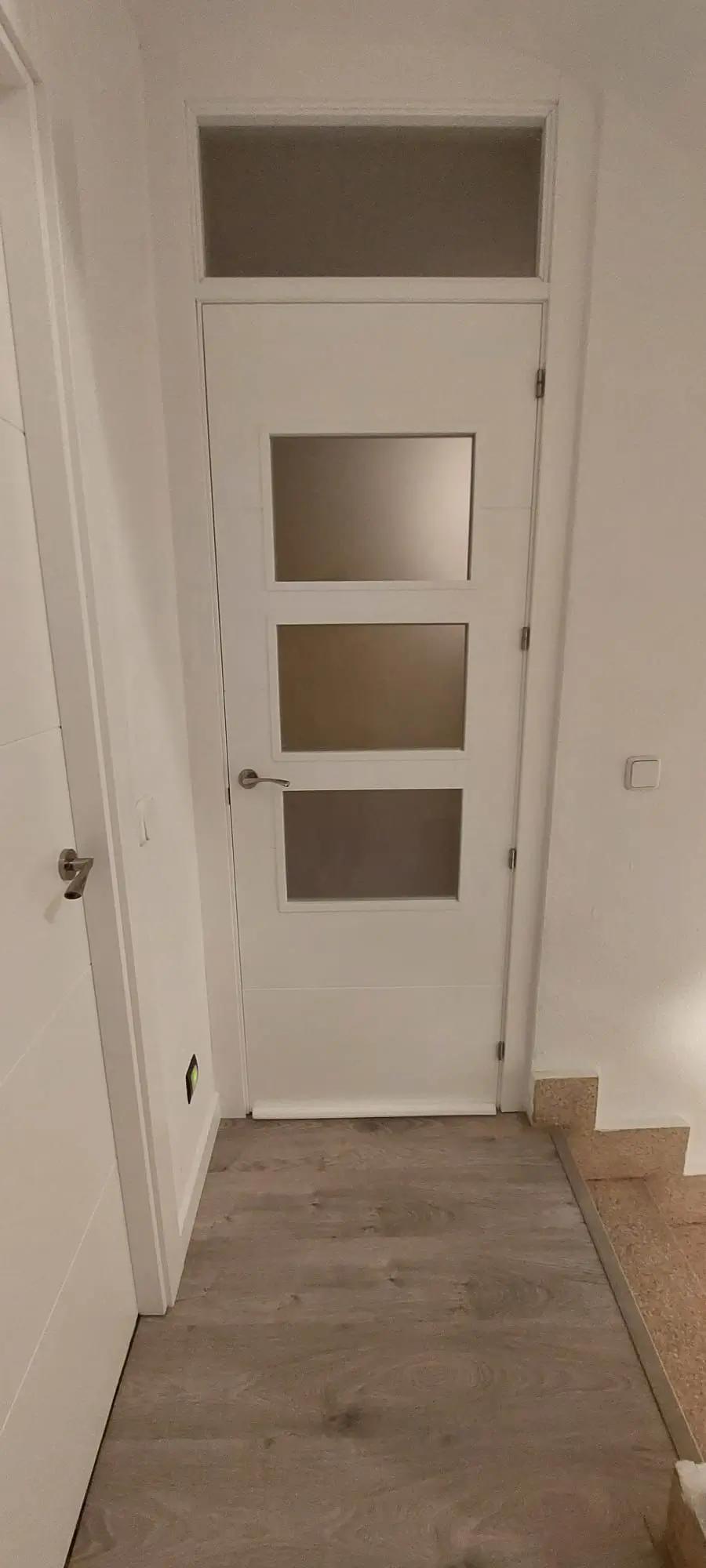Puertas ciegas Lacadas en Blanco modelo DS100 y vidriera mod. DS100 3 vidrios con cristales en mate y montante arriba