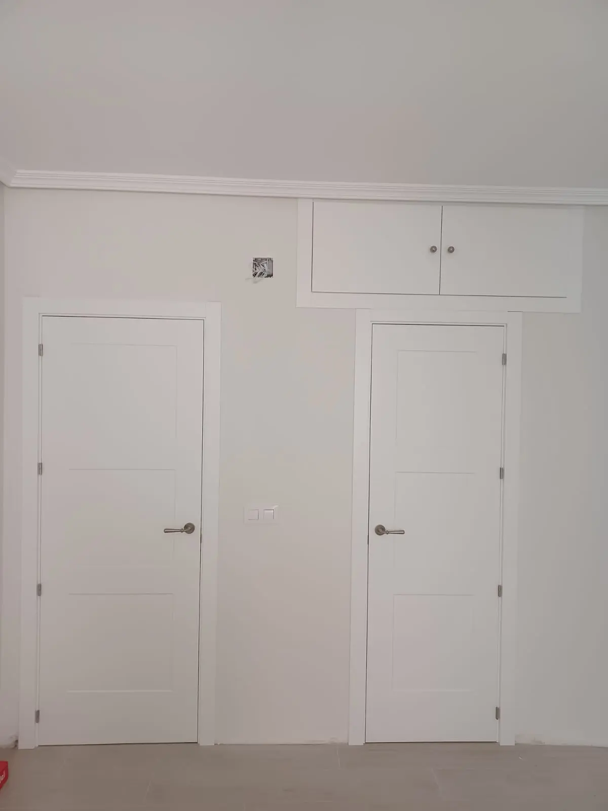 Las puertas con 3 cuadros rebajados lacados en blanco aportarán un toque de elegancia y sofisticación a los espacios interiores. Mientras tanto, los armarios abatibles con cuadros rebajados y cristal blanco en la parte superior combinarán funcionalidad y belleza, permitiendo la entrada de luz natural y creando un ambiente luminoso.