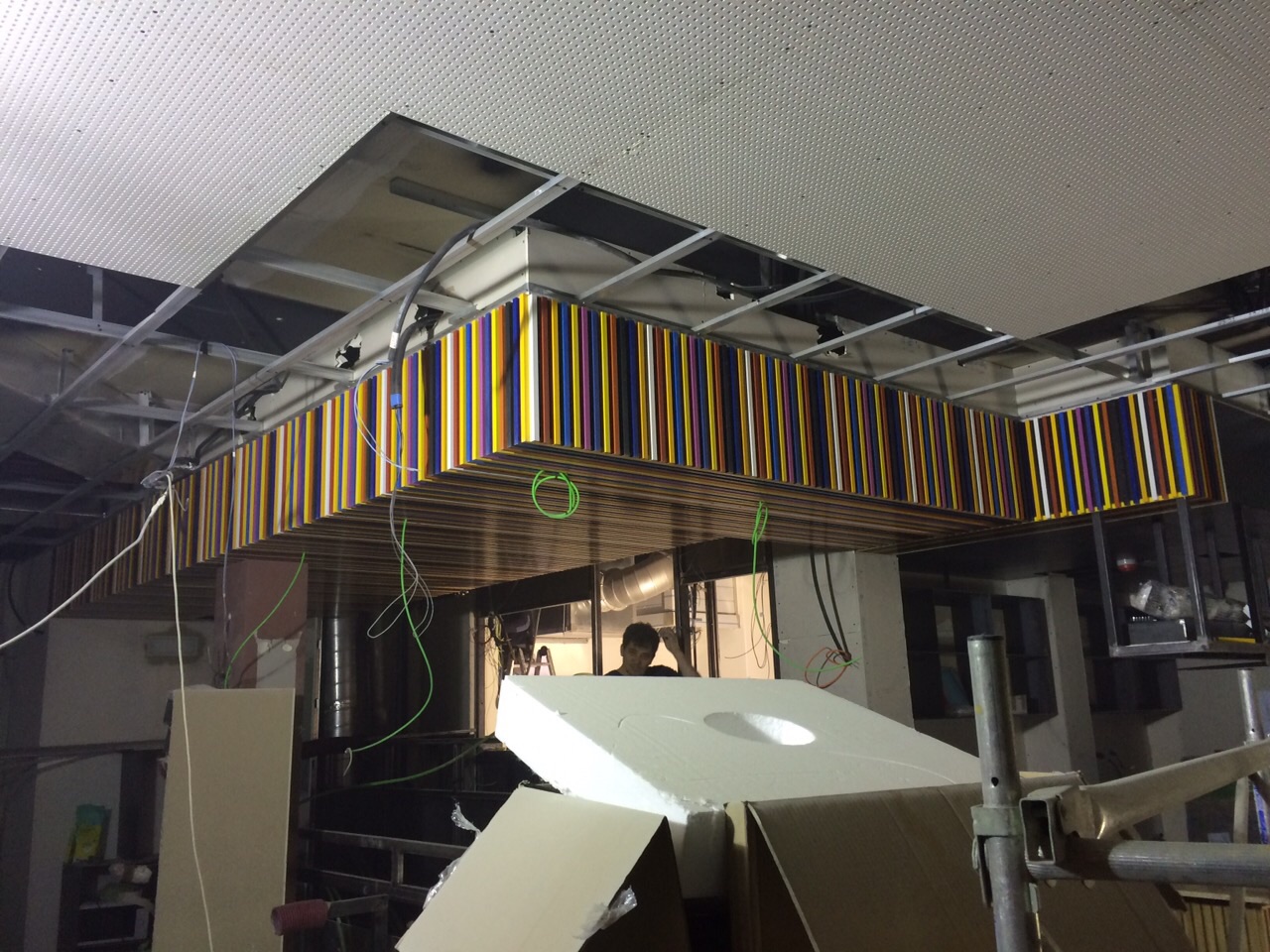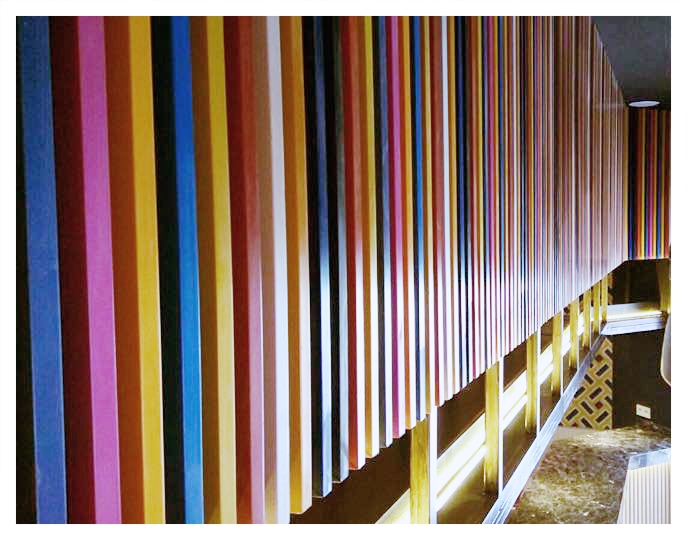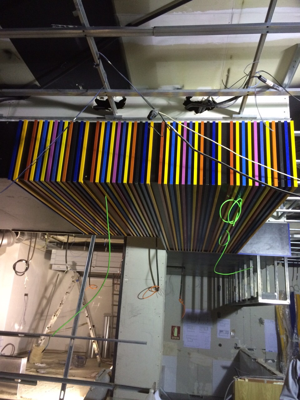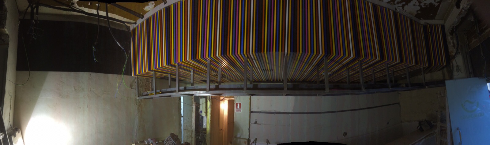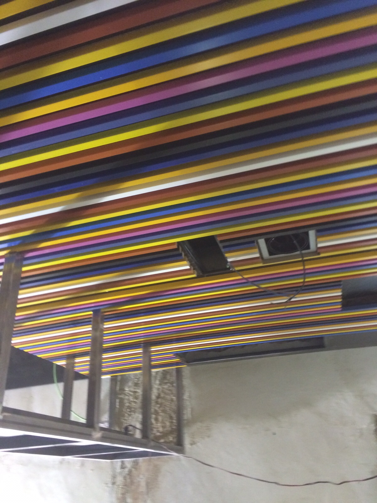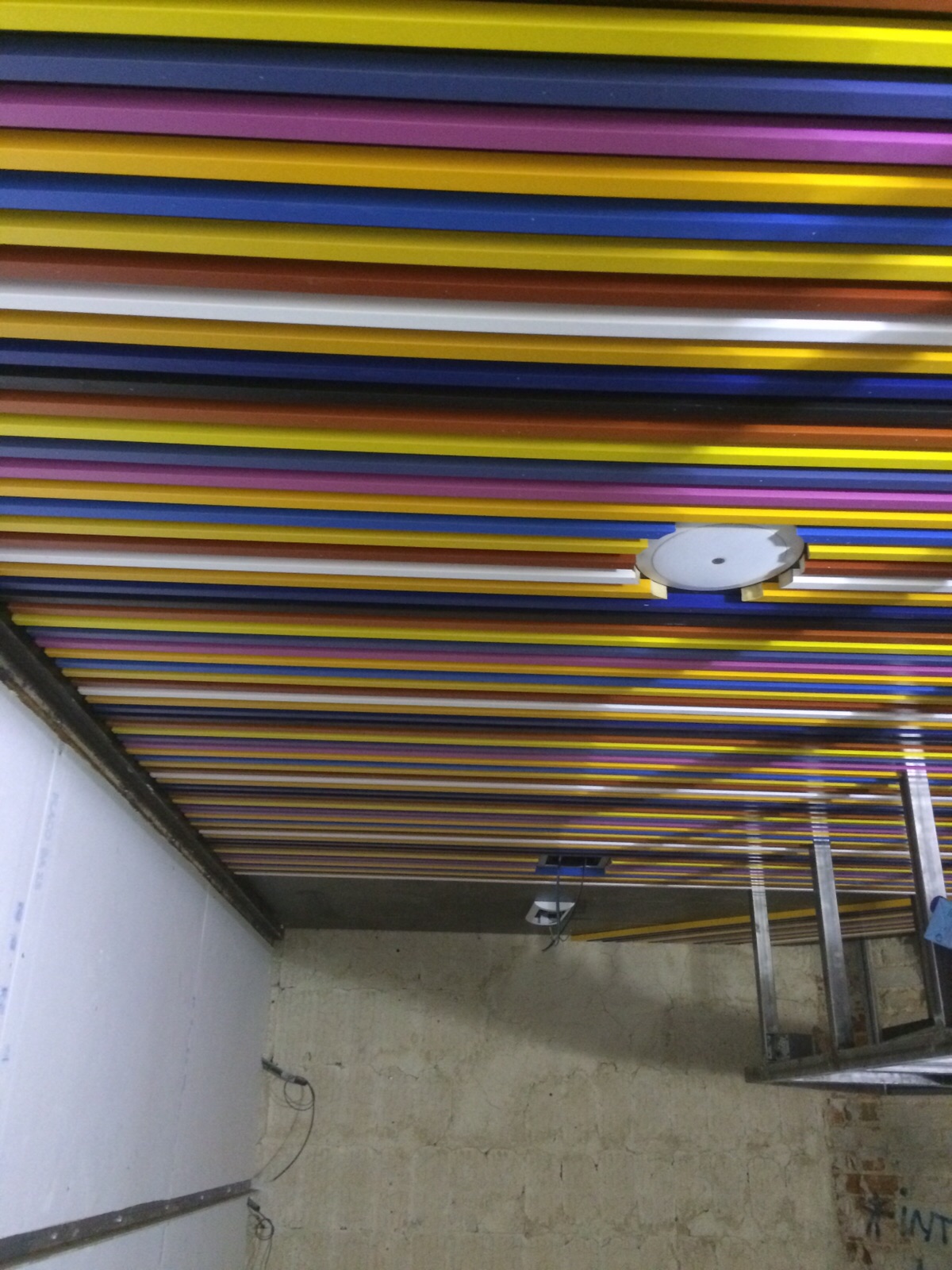Revestimiento de techo de barra con listones de DM lacados en diferentes colores