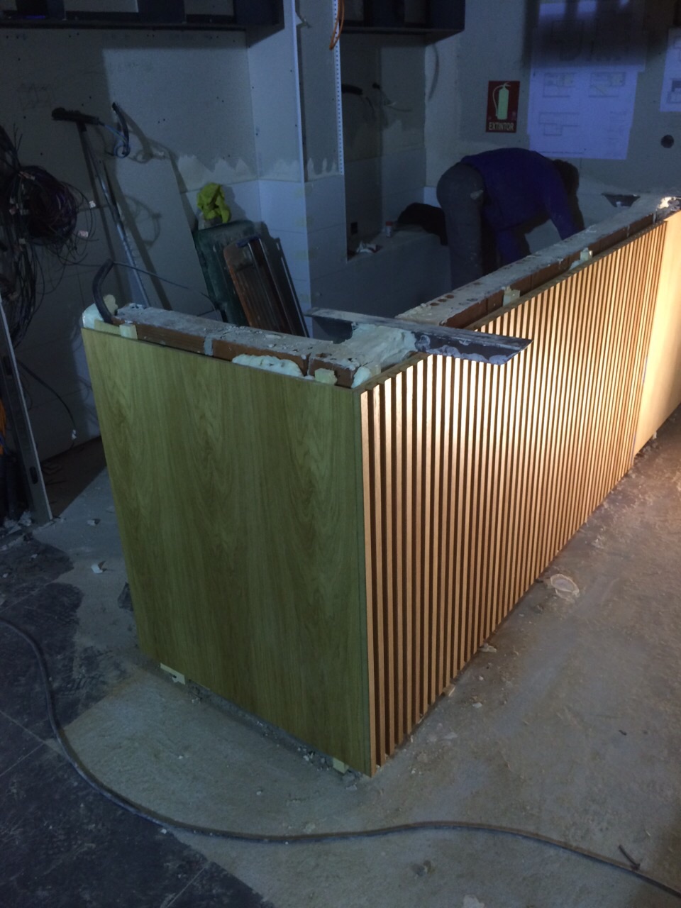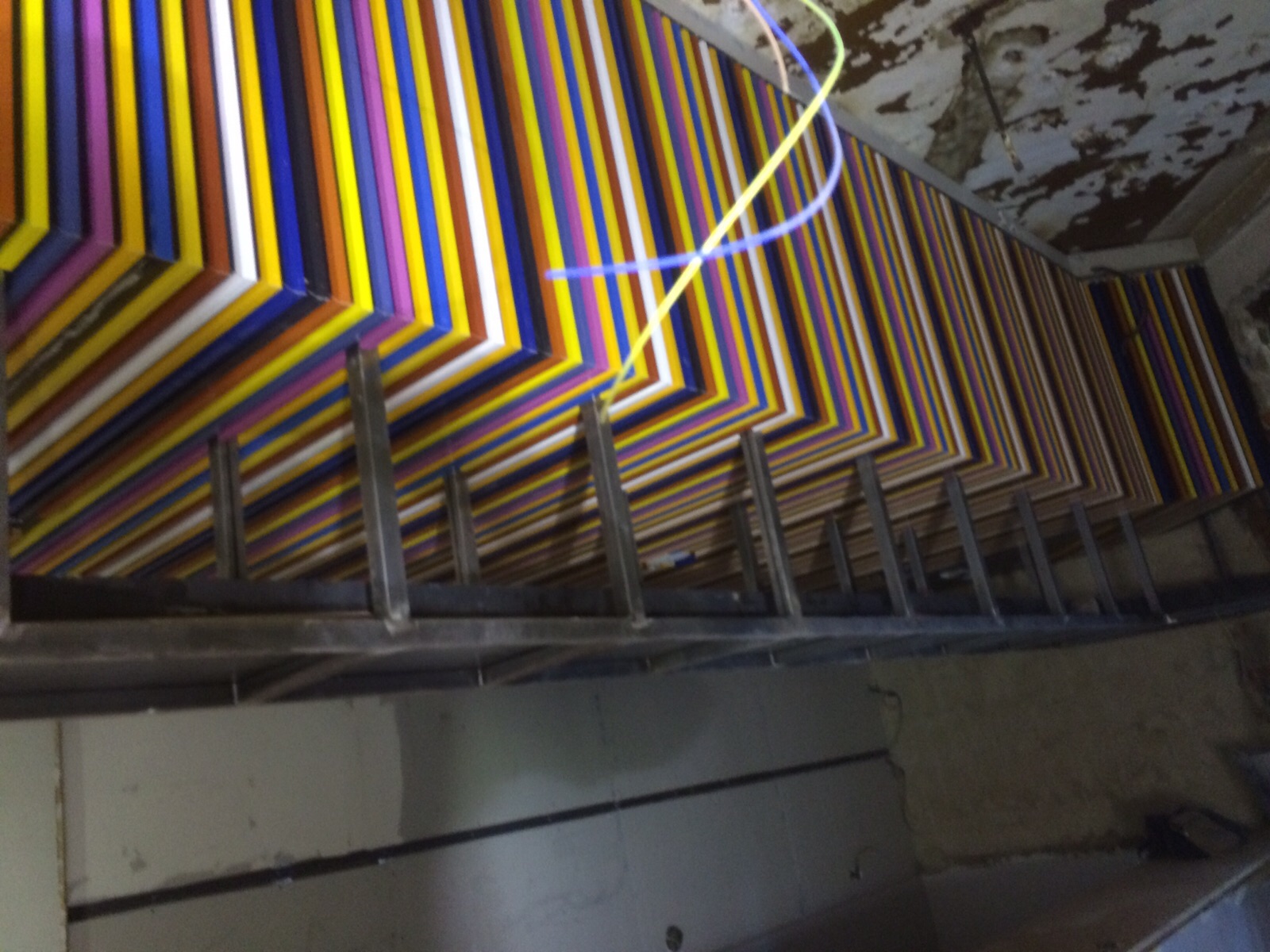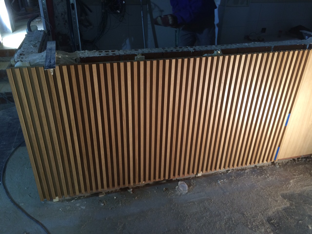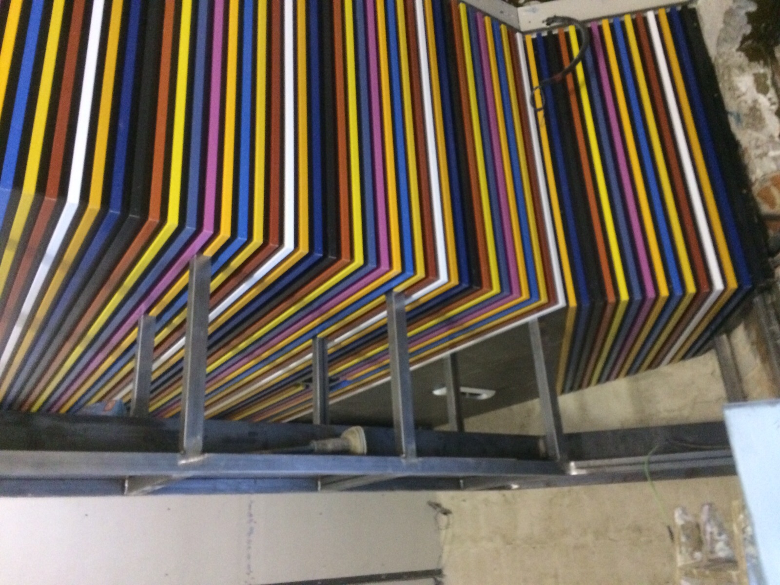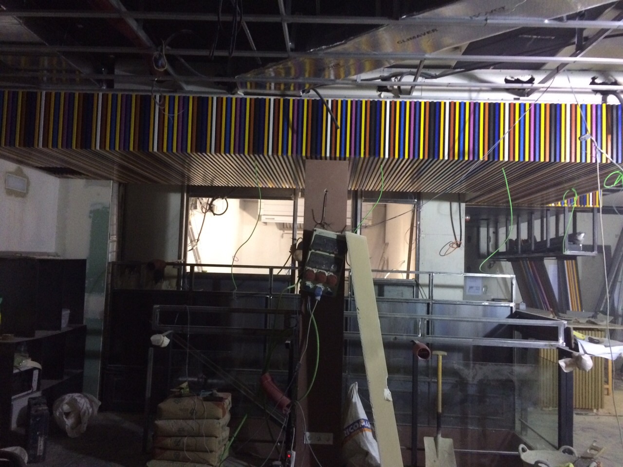 Revestimiento de techo de barra con listones de DM lacados en diferentes colores