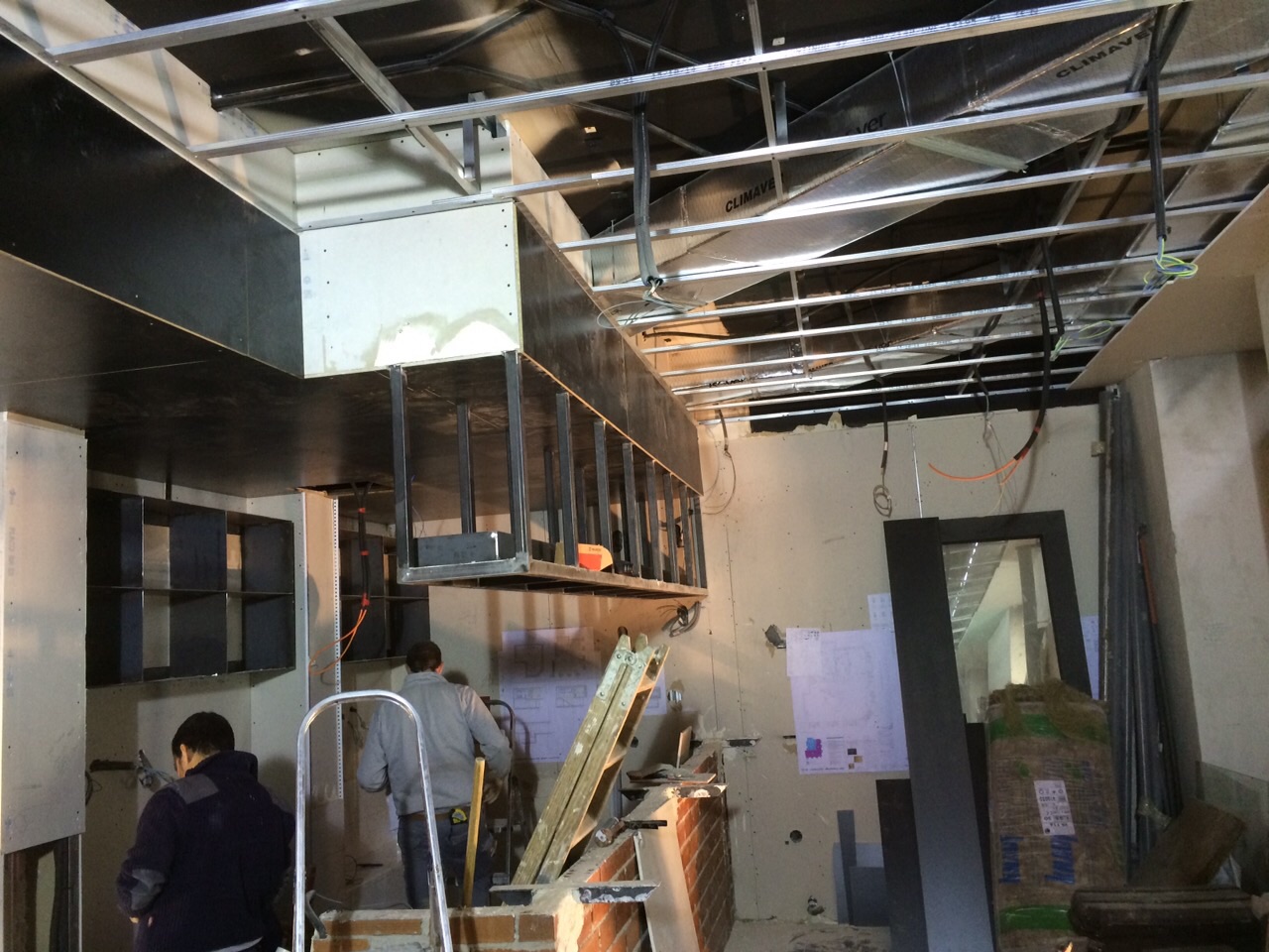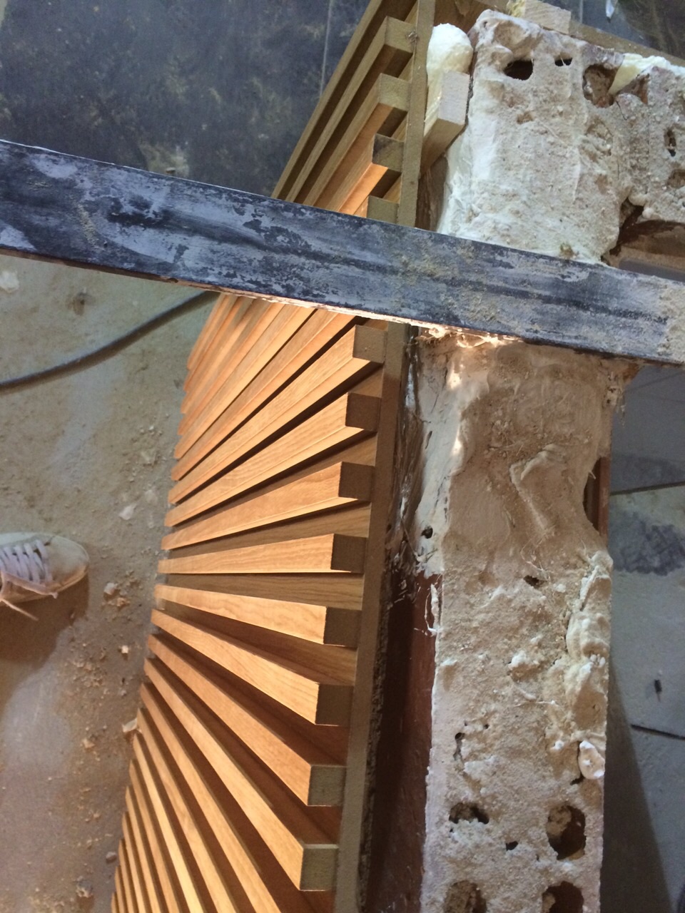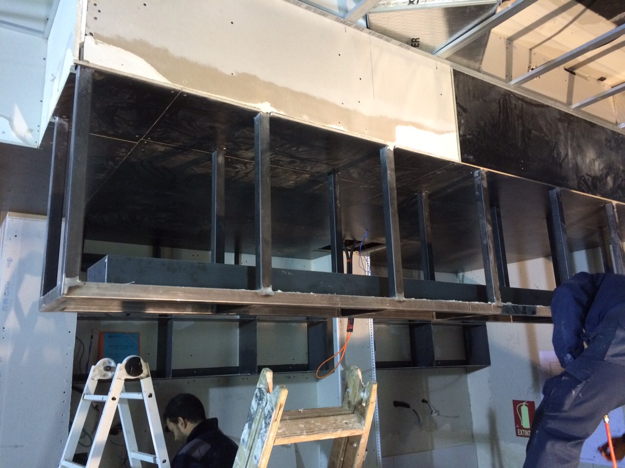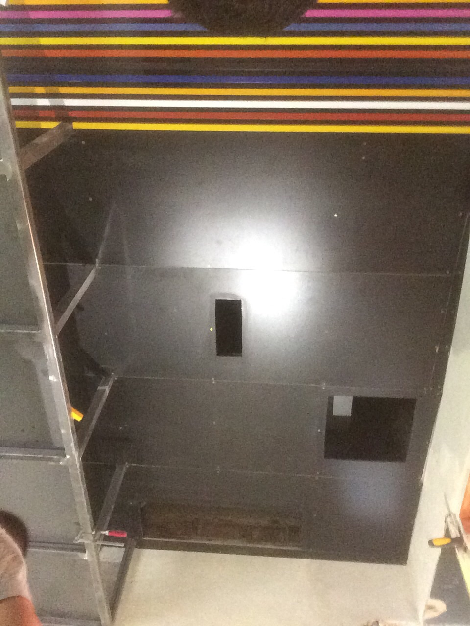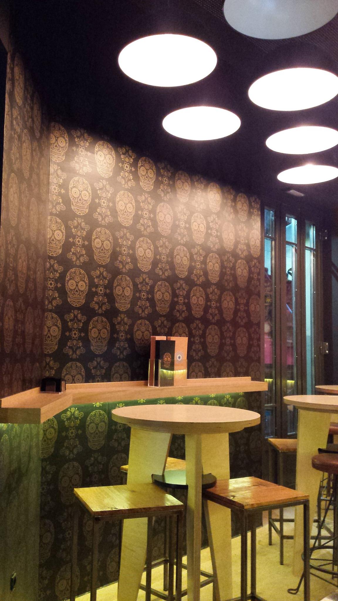Revestimiento de techo de barra con listones de DM lacados en diferentes colores